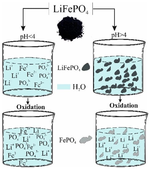 Scheme of LiFePO4 oxidation in an aqueous medium at different pH.