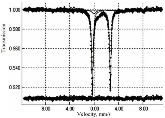 The Mössbauer spectrum of the sample was obtained on a MS 1104Em spectrometer. The source was cobalt 57 in the chromium matrix, with an activity of 100 mCi (the temperature of the spectroscopy was 293 K). Mössbauer spectroscopy is very sensitive in terms of characterizing atoms with different valence states, as it provides a direct scrutiny of atomic information. Therefore, Mössbauer spectroscopy measurement was carried out to analyze the existence of Fe3+-containing species. Figure 3 shows the Mössbauer spectroscopy of the as-prepared LiFePO4/C. One symmetric doublet is dominant, with an isomer shift (IS) of 1.22 mm/s and quadrupole splitting (QS) of 2.94 mm/s, which is typical for octahedral Fe2+ in LiFePO4—92% []. Another minor doublet was observed, which can be attributed to Fe3+ with a typical IS value (0.32 mm/s) and QS of 0.86 mm/s—8%.