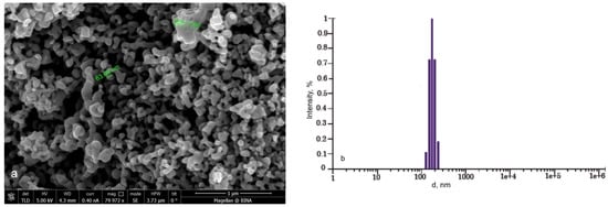 The fractional composition of synthesized LiFePO4/C was determined using a Photocor Compact (Photocor) particle size analyzer. The sample is characterized by a narrow size distribution interval with an average particle diameter of 175 nm (Figure 4b). Figure 4a shows the High Resolution Scanning Electron Microscopy (HRSEM) image of nano-crystalline LiFePO4/C powder. A branch-like morphology with continuous contacts between the particles was observed. The grain sizes vary from 100 nm to 200 nm with similar pore size.