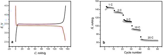 Synthesized LiFePO4/C is a good cathode material capable of operating even at high currents. The material was cycled for 20 times at 20C without severe degradation and an average charge/discharge capacity of 65.0 mAh/g was measured (Figure 5b). This material’s performance is strictly related to its branched structure and low particle size (Figure 4a,b). It is well-known that the uniform particle size distribution leads to the uniform depth of charge/discharge of each particle, which increase the material’s cycling life and enhance the global battery performance.