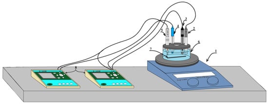 Schematic illustration of the oxidation equipment. 1—magnetic stirrer; 2—platinum electrode; 3—Li selective electrode; 4—pH glass electrode, 5—Ag/AgCl electrode; 6—glass cell; 7—stirrer; 8—ionometer.