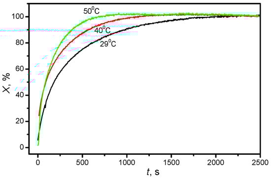 Figure 7 shows the degree of delithiation dependence versus time at different temperatures. The chemical oxidation process is fully realized at all temperatures and the delithiation degree is close to 100% (29 °C–2000 s, 40 °C–1300 s, 50 °C–800 s). Despite that, in our case, the delithiation degree equals 99.8%, which is much higher than the value determined by Mössbauer spectroscopy. According to the results of Mössbauer spectroscopy, the oxidation percentage of LiFePO4/C should not be higher than 92%. However, in this case we measured the total amount of lithium that can be extracted from 92% LiFePO4 and from 8% impurities (since the Li:Fe ratio was 1:1 in the synthesis). Unlike the coulometric method, chemical oxidation in alkaline solution provides mistaken results. Probably, the results were influenced by the indirect determination of divalent iron ions, along with the lithium ions from the solution.