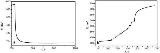 When the equivalence point was reached, a sharp jump in the potential was registered due to the formation of a new Ox-Red pair (Cr2O72−/Cr3+) (Figure 8b). The established Ox-Red potential of the solution increased insignificantly after the jump, followed a plateau, which suggests the complete oxidation reaction.