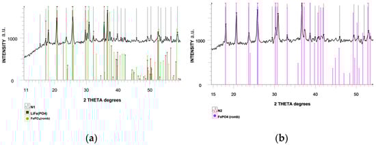 To confirm the efficiency of this method, the synthesized LiFePO4/C was half oxidized (t = 200 s) and completely oxidized (t = 2000 s), respectively, in alkaline medium by hydrogen peroxide (at room temperature) followed by the filtration and drying of the powder. For the determination of the oxidation degree, the latter obtained samples were analyzed by Mossbauer spectroscopy, XRD, and chemical oxidation method in acidic medium. XRD patterns indicate the presence of two phases (olivine and heterozite) in the case of half-oxidized material (Figure 9a) and only the heterozite phase for completely oxidized material (Figure 9b).