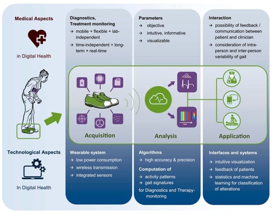 Mobility monitoring technologies demand research in sensor-based data acquisition and its subsequent analysis to support objective and clinically relevant gait analysis outside of conventional clinical environments []. The mounting popularity of this research topic is reflected by the annually increasing number of related articles as shown in Figure 1. Thus, this paper aims to provide an overview of the important engineering aspects of smart-shoe applications in the field of IoHT. It will also highlight the differences and requirements of the related engineering and medical needs (Figure 2), which are critical components for effective biomedical engineering solutions.