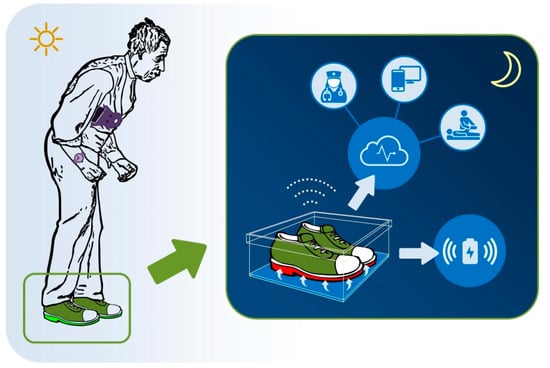 Practical use of smart shoes within the IoHT: capturing gait signals of patients with impaired gait (daytime use), data storage, and battery charging (nighttime use). Icons modified and printed with permission of [,,]. Patient figure adapted from [].
