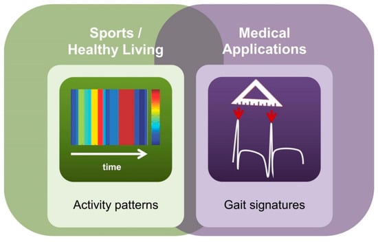 In this section, we outline concrete application examples for smart shoe systems that make use of the described acquisition and analysis steps. First, we will outline sports and healthy living applications that benefit from both activity pattern as well as gait event detection algorithms. Then, we focus on medical applications, which are based on detecting specific gait signatures and gait-specific parameters.