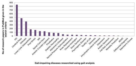 Distribution of research efforts on different gait pathologies (data originates from research papers published between 1970 and 2016). Figure modified with permission of the authors of []. PD: Parkinson’s disease; MS: multiple sclerosis; ADHD: attention deficit hyperactivity disorder.