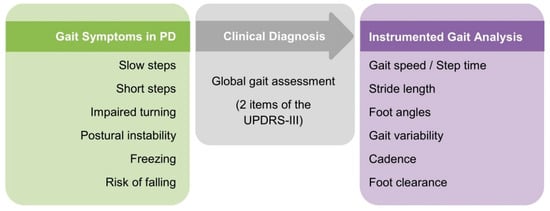 As an example for typical gait impairment, patients suffering from PD show four cardinal symptoms: bradykinesia, rigor, tremor, and postural instability []. These major symptoms, with the exception of tremor, affect gait and consequently PD disease characteristics are associated with gait impairment. The clinical gold standard in rating motor symptoms is the Unified Parkinson Disease Rating Scale Part III (UPDRS-III) as described from the Movement Disorder Society []. However, since only 2 out of 16 items of the UPDRS-III assess walking tasks, gait is under-represented in this clinical score, and complementary measures are necessary. Sensor-based gait analysis systems are able to close this gap (Figure 7).
