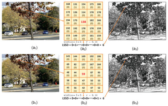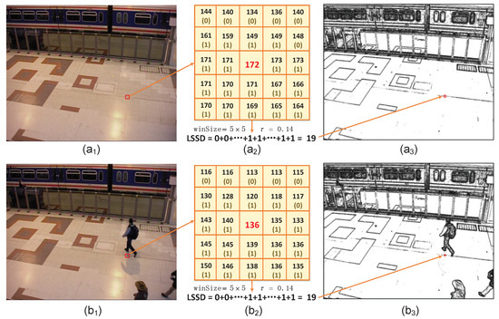 As shown in Figure 3, (a 1 ) and (b 1 ) are the first and 56th frames selected from the PETS2006 sequence, and (a 3 ) and (b 3 ) are the corresponding LSSD feature images (for display purposes, the feature values are rescaled to [0, 255]). In order to simplify the calculation process and make it easier to understand, we convert the color images to gray images and choose a special pixel p with the coordinate of (512, 391) to demonstrate how to get its LSSD feature. First, a image patch with the size of 5 × 5 centered at p is cropped out from the input image (the small red box in (a 1 ) and (b 1 )); the patch intensity values are shown in (a 2 ) and (b 2 ). Then, all of the neighborhood pixels are compared with the central pixel p. If the intensity difference falls within a similarity interval [ - τ I p , τ I p ] , the neighboring pixel is considered similar to the central pixel, (see Equation (8)). As we can see in (a 2 ), the central pixel value is 172, the similarity threshold τ I p equals 24, and finally we get the LSSD feature of 19, which is the value of p ( 512 , 391 ) in (a 3 ). In the same way, the LSSD feature value of (b 2 ) is obtained as 19.