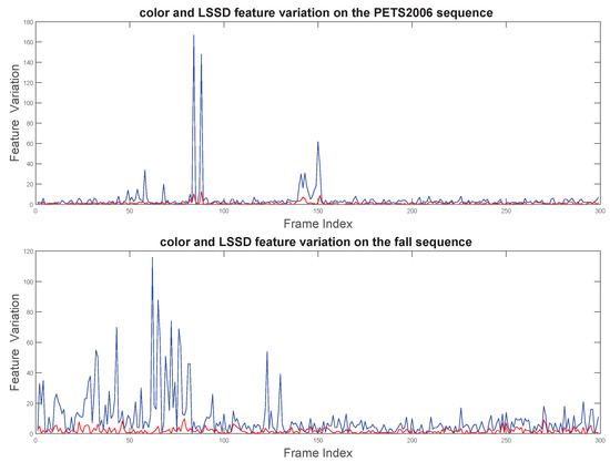 Compared with other texture features like LBP [21], SILTP [22] and LBSP [26], the proposed texture feature LSSD not only has the merit of dealing with illumination variations, but it also has strong robustness to complex background motions. For example, if we concatenate all the compared results of Equation (8) into a binary string like other texture features do, then the new LSSD feature of Figure 3(a 2 ) can be represented as: 00000 11110 11111 11111 11111 and Figure 3(b 2 ) can be represented as: 00000 11110 11111 11111 11111. Taking the bitwise XOR operation to get the Hamming distance, we can see that the result is the same with the LSSD distance. However, in the case of dynamic background motions shown in Figure 4, the new LSSD feature of (a 2 ) can be represented as: 01100 01000 00100 00000 11000, and (b 2 ) can be represented as: 00000 00000 00100 11001 01001. The Hamming distance is 8, while the LSSD distance is 0, which is what we expect. In Figure 5, we also show how the color and LSSD feature values change between consecutive frames. Firstly, in the top subgraph, we give the feature variation plot of the pixel p ( 512 , 391 ) from the first frame to the 300th frame of the PETS2006 sequence with illumination changes. Then, in the bottom subgraph, we give the feature variation plot of the pixel p ( 212 , 69 ) from the first frame to the 300th frame of the fall sequence with dynamic background motions. The blue line represents the color feature variation and the red line represents the LSSD feature variation. We can see that the variation of the LSSD feature is much smaller, which indicates the robustness of the LSSD feature against different challenges. In Section 4.4, we will give a more detailed comparison between LSSD and other texture features.