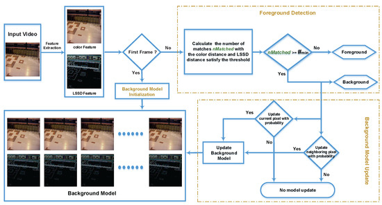 In this section, we will give a detailed description of the framework for the proposed background subtraction method, including background model representation, background model initialization, foreground detection, and a background model update. Figure 6 provides a flow chart that captures the entire proposed method.