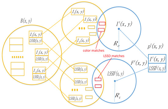 In order to integrate the color feature and LSSD feature into the consideration, in the match-calculating procedure, we first calculate the color similarity. If the color distance is less than the pre-defined threshold R c , then LSSD similarity is calculated. That is to say, to find a match through Equation (13), both the color and LSSD feature must be successfully matched. Figure 7 displays the matching process.