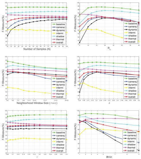 then a color feature match is found. The color threshold R c controls the robustness of the background model. A small R c leads to sensitive foreground detection result, while a larger R c has better resistance against relevant change, but makes it more difficult to detect foreground objects that are very similar to the background. We also determine the value of R c based on the experiment results performed on the CDnet2012 dataset [28]. As it can be seen in Figure 9 (the second subgraph), the overall F-Measure score tends to arrive at a maximum when R c sets the value of 15.