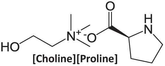 22], in which it is denoted IL2. The synthesis of the IL was as follows: Choline hydroxide solution was added dropwise to equimolar proline amino acid with ice cooling. In the next step, the mixture was magnetically stirred at room temperature for 48 h. Afterwards, the water in the mixture was removed using a rotary evaporator at 60