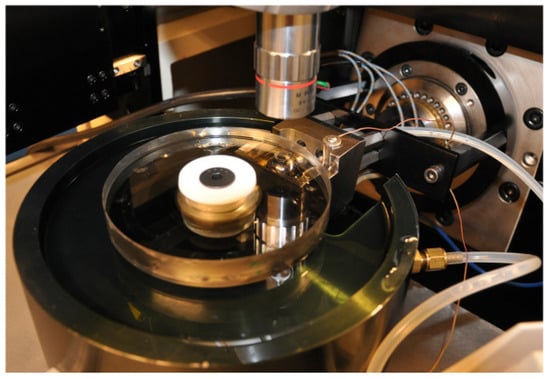 The experiments were carried out with a Wedeven Associates Machine (WAM) 11, ball on disk test device. The lubricant is supplied at the center of the disk in an oil dispenser that distributes the lubricant across the disk surface. The lubricant is circulated in a closed loop from the oil bath, through a peristaltic pump to the oil dispenser at the center of the disk. The peristaltic pump is delivering approximately 180 mL/min. Three thermocouples are used in the test setup, one located in the oil bath, one in the outlet of the oil supply, and one trailing in the oil film close to the inlet region of the ball on disk contact. A more thorough description of the test rig and its features is presented in previous work [