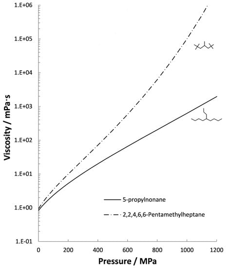 Here it is clear that the highly branched 2,2,4,6,6-Pentamethylheptane has a significantly higher pressure viscosity response than 5-propylnonane. The same is true when going from linear to cyclic and then to polycyclic structures [