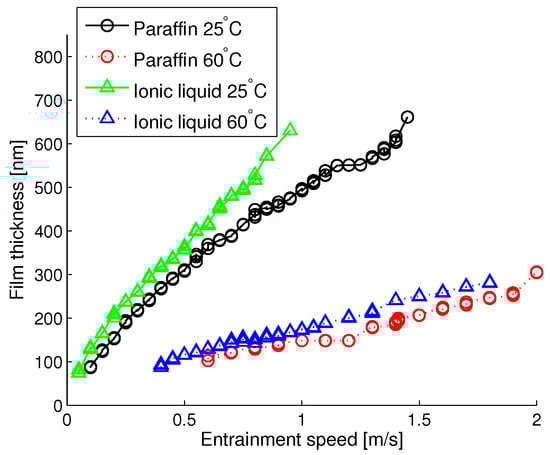 Figure 6 shows the central film thickness of [Choline] [Proline] containing slightly less than 15 wt % water and the paraffin oil at 25 and 60