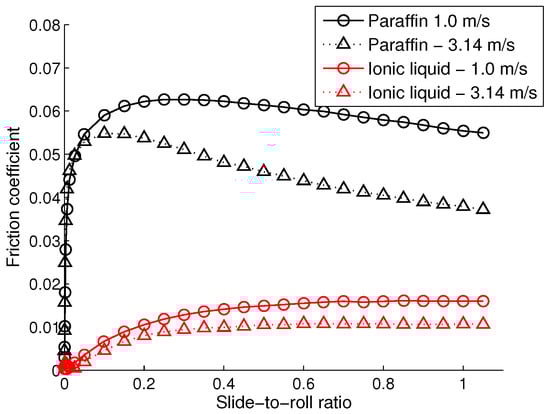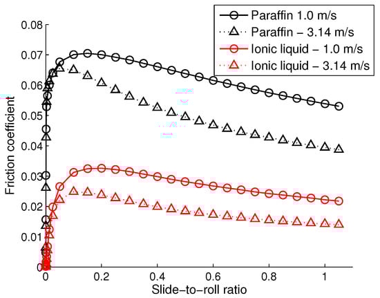 Figure 7. The friction coefficient for the IL is substantially lower than the friction coefficient for the paraffin oil at both entrainment speeds.