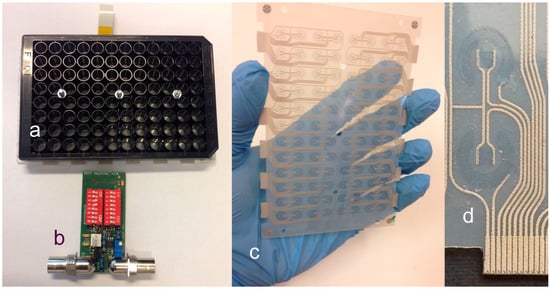 Encapsulated organic electrochemical transistor (OECT) 96 well microplate for electrogenic cell cultivation and investigation (a) with a power source-signal amplifier and current/voltage converter (b), foil with functional printed patterns of all OECTs in a 12 × 8 array (c), and a detail of a couple of OECTs with a poly(3,4-ethylenedioxythio-phene) :poly(styrene sulfonic acid)—PEDOT:PSS printed channel and gate electrode (d).