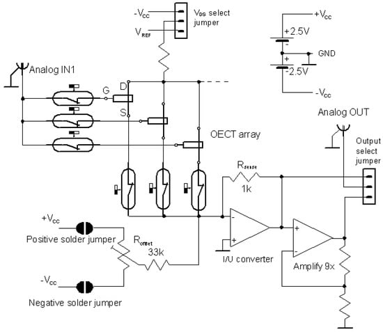 The electrical circuitry designed for OECT testing in schematic form is depicted in Figure 2. The contact array on the microplate foil was contacted by 18-pin Molex connectors and 18-wire ribbon conductors so that eight OECTs were connected by a single connector and individual OECTs can be selected from the array by a proper couple of microswitches. The gate potential Vgs is set from the outer source in a range from −0.8 V to 0.8 V with respect to preventing redox reactions on electrodes and a source drain voltage Vds down to −0.725 V can be set. The source current Is was converted to voltage in an I/V converter and recorded by a scope after further amplification. The offset Is at a stable working point can be compensated for by setting the corresponding opposite current at the input of the operating amplifier. The zero Analog OUT voltage can be set for an input voltage of Vgs = 0 V with the aid of a Roffset resistor/potentiometer. The feedback resistor Rsense = 1 kΩ gives a conversion of 1 mA/1 V. Further amplification is enabled by switching the output jumper.