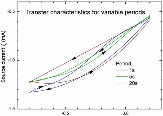 Transfer characteristics measured at the triangular gate periodic voltage at various periods.