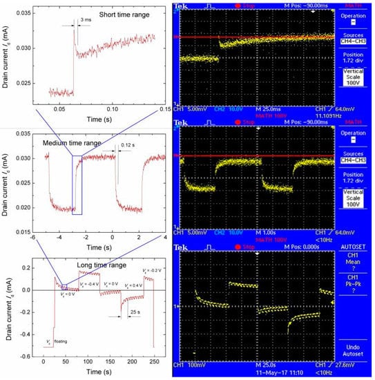 The faster rectangular modulation, applied to the Vgs simulating a signal of electrogenic cells (cardiomyocytes), lent importance to the measurement. A period of 5 s was set in order to get the source current Is to a sufficiently steady state (Figure 4, medium time range) for the deduction of the time constant τ of the gate circuit. The medium current response is almost not influenced by material relaxation. The ΔIs response on the modulation represents a consequence controlled by charging and discharging the EDL capacitance at the electrolyte—PEDOT:PSS interface.