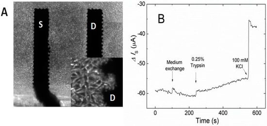 Electrochemical transistor with confluent layer of 3T3 fibroblasts: S—source, D—drain (A). The electrical response to cell release due to trypsin. 100 mM KCl spike served as a positive control of transistor function (B). Typical results out of three biological replicates are shown.