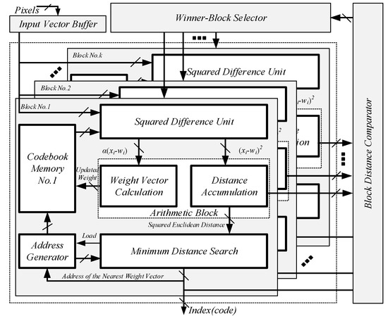 Numerous vector quantizers have been presented in the previous literature [10,11,12,13]. Specifically, M. Fujibayashi et al. [10] developed a novel vector quantizer with a method of needless calculation elimination. Their work successfully decreased the computational cost to 40% of the conventional full-search scheme. Similarly, the authors in [12] employed a concept of operator sharing in their design and thus effectively reduced the complexity of each neural cell in SOM. Furthermore, to accelerate the best matching vector searching phase in VQ, W. Kurdthongmee [13] tactfully used the distance as the address of codebook memory to store index. This made the time for the best matching vector searching process decline to only one clock.