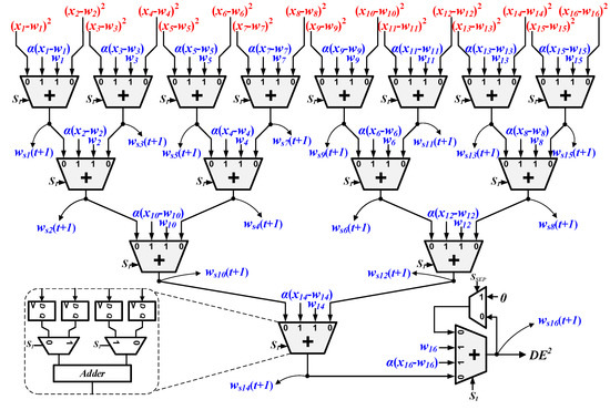 As discussed in Section 3.2, the SDU can merely calculate the basic elements, (xj − wij)2 and α(xj − wij), for distance calculating and weight vector updating. In order to obtain the absolute values of SED () and the new weight vector (Ws(t + 1)), extra calculations must be conducted. In our work, we proposed an optimized circuit named RCBAT to accomplish these operations.