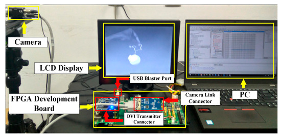 Under such conditions, the synthesis results indicate that the obtained maximum clock frequency is 79.8 MHz. Furthermore, to verify our design, an image compression system based on the proposed vector quantizer is developed for high-speed target tracking application and exhibited in Figure 5. As shown in Figure 5, the demonstration system is composed of a high-speed image sensor, a FPGA development board, a display, and a PC. The camera link connector and DVI (digital visual interface) transmitter connector are inserted into the FPGA board for image capture and display.
