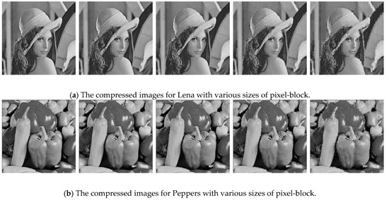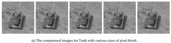 Visual quality comparisons between the compressed images for (a) Lena, (b) Peppers, and (c) Tank. The images in each row from the left to the right are the compressed images as the sizes of pixel-block are 4 × 4 (the corresponding compression ratio is 16), 4 × 8 (the corresponding compression ratio is 32), 8 × 8 (the corresponding compression ratio is 64), 8 × 16 (the corresponding compression ratio is 128), and 16 × 16 (the corresponding compression ratio is 256), respectively.