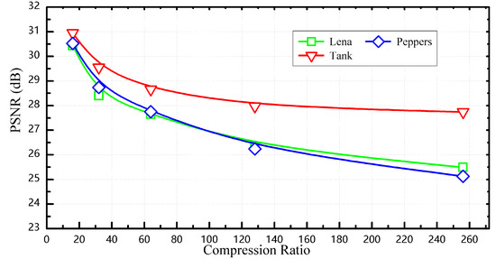 We have conducted several experiments to intuitively evaluate the compression performance of our proposed vector quantizer. To make the experimental results comparable, three standard grayscale 512 × 512-pixel images from the USC-SIPI (University of Southern California-Signal and Image Processing Institute) image database, respectively—Lena, Peppers, and Tank—were adopted as the test data. As mentioned before, the codebook size is set as 256, and the number of multi-parallel processing sub-blocks is set as 32. In this way, the 256 weight vectors are equally distributed into 32 blocks, and thus the processing speed is greatly improved. During the codebook generation phase, the pixel values of Lena are utilized as the training data. Once the phase of codebook generation is completed, Lena, Peppers, and Tank are encoded by the trained codebook in sequence. Moreover, several sizes of pixel-block including 4 × 4, 4 × 8, 8 × 8, 8 × 16, and 16 × 16 are employed to judge the visual quality of the reconstructed images with different compression ratio. Figure 6 shows the visual quality comparisons between the compressed images with various compression ratios. It can be seen that the compressed images are able to keep relatively acceptable visual quality even if the pixel-block of 8 × 8 is employed (the corresponding compression ratio is 64). Finally, the visual qualities of the compressed images with different compression ratios are quantified by the metric of peak signal-to-noise ratio (PSNR) and plotted in Figure 7. Figure 7 indicates that the PSNR of Lena in our work is about 30.69 dB as the compression ratio keeps to 16, which is slightly worse than that in [11]. That may stem from the truncation error in the fixed-point calculation when different types of word-precision are adopted. Finally, benefiting from the mechanism of PVCS, we can adjust the compression ratio by changing the value of m, which has been discussed in Section 3.2.