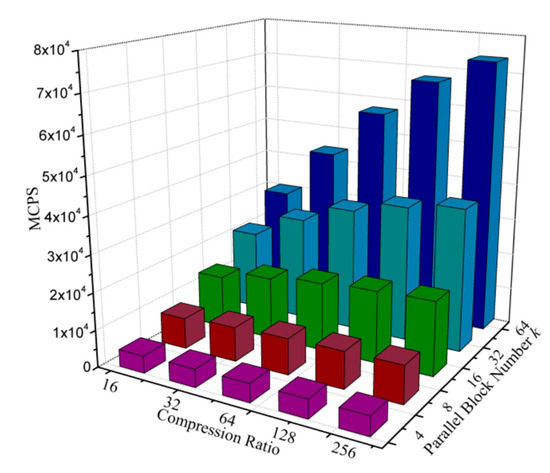 MCPS (million connections per second) of the proposed vector quantizer with different compression ratio and parallel block number.