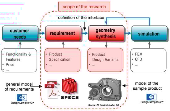 This model consists of an illustration of five main process steps. In the first step, “Customer Needs” are collected and clarified. These can be transformed into a product specification that is generated in a second step, “Requirements”. Based on specific “Requirements”, a specific design approach (“Geometry Synthesis”) can be carried out. A further step of the design process is “Simulation”, and within this step, product analysis processes are carried out by means of simulation preprocessor, solver, and postprocessor, such as the Finite Element Methods (FEM) or Computational Fluid Dynamics (CFD). It is important to note that further steps of the product life cycle are not shown in this simple model. In the presented research, the scope was on the process steps “Requirement” and “Geometry Synthesis”. There is no doubt that strategies, methods, and tools which help determine and clarify the “end-user” customer needs are also a promising field for research. However, due to the nature of the analyzed product development processes, the later steps were chosen as a focus of the presented research.