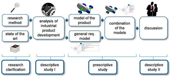 The presented research focuses on an investigation of a novel approach (graph-based design languages for requirements management). This can be characterized as a research project type five (compare [4] and [5]). Here, product development support is created on the basis of a detailed generation of product development process understanding, and is initially evaluated. The research clarification is based on the state of the art (compare Section 3). This analysis led to the formulation of the central research thesis: It is possible to enable effective and efficient requirements engineering in industrial companies by means of the application of graph-based design languages. The first descriptive study is carried out by a detailed analysis of an industrial product development process (compare Section 4). The prescriptive study is carried out intensively and results in two models in graph-based design languages and their combination (compare Section 5 to Section 7). The evaluation and validation by means of a second descriptive study is performed in an initial manner for this kind of research project, and consists of a test of the general applicability of the approach and expert interviews in the concerned industrial company (compare Section 8). Obviously, the research type five (compare [4] and [5]) cannot really prove a research thesis, but it can indicate that the application of product development support is logically sound and carries some process improvement potential. A reflection of the research structure in the structure of this paper is shown in Figure 4.