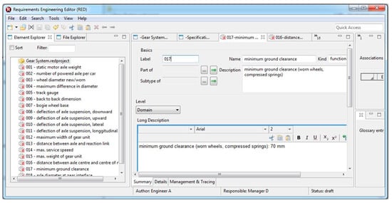 Today, elaborate software packages for requirements management are available; best known are the products Teamcenter Systems Engineering [27], Rational DOORS [28], and Serena Dimensions RM [29]. A profound overview of requirements engineering tools is given by Carrillo de Gea et al. [30]. These systems share the objective to support requirements management in distributed environments. Meanwhile, the exchange format ReqIF (an XML file format) is a widely accepted standard for the lossless exchange of requirements between different systems. Further information about ReqIF can be found in the OMG specification [31] or in [3]. For some years now, open source tools for requirements management have been made available, e.g., “RMF/ProR” [32] or the Requirements Editor RED ([33]—download under DTU [34]). Figure 6 shows the requirements of a gear system for light trains modelled in the Requirements Editor RED.