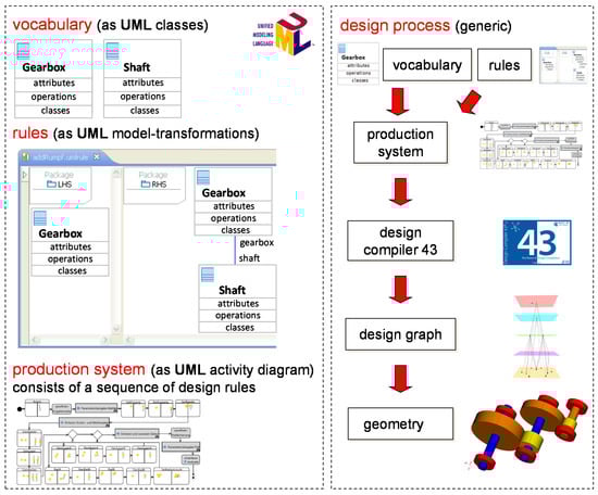As stated above, the main elements of a graph-based design language are vocabulary and rules. Vocabulary are UML-based components, e.g., the Gearbox itself or one of its shafts (Shaft). Rules are UML model transformations: these show the input status (only car) on the left side (LHS) and the output state on the right side (LHS—Gearbox with connected Shaft—see Figure 1). The engineer creates the UML model, which compiles the program into a design graph, from which, for example, the geometry of the product can be derived. Vocabulary and rules are linked in a so-called “production system” (UML activity diagram). Through the design compiler, the rules are executed to instantiate the class/vocabulary. This compilation process builds the central data model. From this central data model, different interfaces generate domain-specific, generic models, such as geometry models or simulation models. This application of graph-based languages allows for the automatic generation and evaluation of multiple product variants and is currently being introduced in several industrial companies.