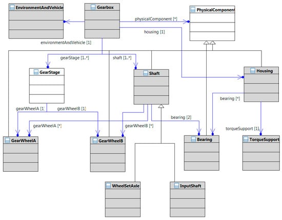 Each model that is modelled in the graph-based design language consists of various classes that are determined by decomposition of a given product model. Based on the UML notation for object-oriented systems, all derived classes can be connected to each other through utilization of association or generalization (compare Figure 4). The linked classes form a class diagram (synonymous for vocabulary in Figure 7), which represents the product architecture. Consequently, the class diagram shown in Figure 11 is valid for single-speed reducers, as they are common in EMU.