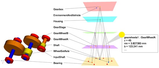 A connection exists for an instance of the class “requirement” that specifies the distance between axle center and center of motor shaft (compare Figure 16, highlighted blue node) to the related part of the gear system, instance of class “Housing”. Whereas the instance of the class “Housing” has an influence on its underlying components/parts.