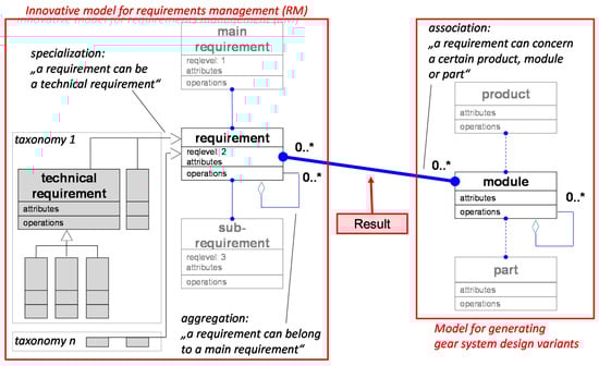 Requirements can be linked to modules or components of the product or to the product as a whole, regardless of the point at which the product life cycle is situated. That leads to an assignment of gear system classes to requirements or vice versa (compare Figure 15, blue association between red frames). Hence, attribute “RelatedToPart” is introduced within structuring of requirements, and a concrete assignment from a certain requirement to its related product, module, or part can be described.