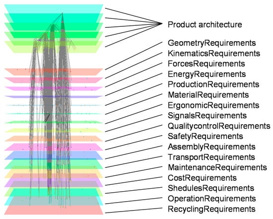Example for a design graph of instances of the product architecture and requirements classified by the fourth taxonomy of Figure 13.