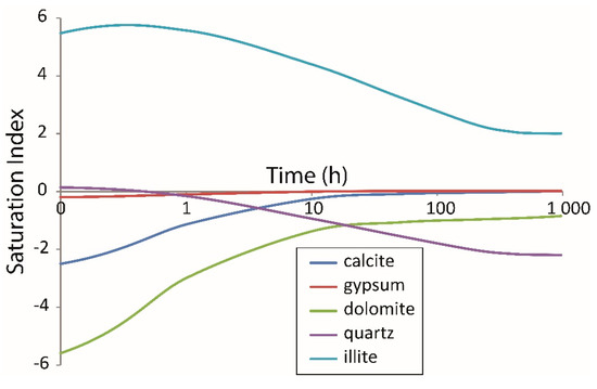 Evolution of the saturation index for the different minerals over the batch experiment time obtained by the numerical simulation performed on CrunchFlow.