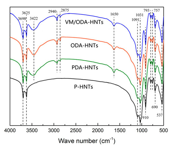 The FTIR spectra of the P-HNTs, PDA-HNTs, ODA-NHTs, and VM/ODA-HNTs were investigated to confirm the structures and chemical groups of pure and surface modified HNTs as shown in Figure 4. In the spectra of P-HNTs, two strong absorption peaks appeared at 3698 cm−1 and 3625 cm−1, which were ascribed to the stretching vibration of AlO–H bonds. As for the HNTs spectra in fingerprint region ranging from 2000 to 500 cm−1, the peaks at 1091 cm−1 and 1031 cm−1 represented the in-plane stretching vibration of Si–O bonds and symmetric stretching of Si–O–Si was observed at 793 cm−1. The spectral bands at 910 cm−1 and 690 cm−1 correspond to the stretching vibration of Al–OH bonds. Besides, the perpendicular stretching and deformation banding vibration of Si–O–Al were obviously found at 757 cm−1 and 537 cm−1, respectively. These peaks were in common with the FTIR spectra of HNTs investigated by Yuan et al. [46], indicating that the typical structures and chemical groups of HNTs were retained after the purification of acid treatment. After being treated by PDA, there remained little changed in the characteristic peaks of pure HNTs. The new peaks at 3422 cm−1, 2940 cm−1/2875 cm−1, and 1650 cm−1 that were found in PDA-HNTs were attributed to the stretching vibrations of –OH groups, non-symmetric/symmetric stretching vibrations of –CH2 groups, and the stretching vibrations of aromatic C=C groups, respectively, which proved that PDA had been successfully decorated on the HNTs surfaces [32,47]. In comparison to the spectra of PDA-HNTs, the absorption peaks at 2940 cm−1 and 2875 cm−1 in ODA-HNTs were enhanced, which was ascribed to the secondary reaction of grafting long chain alkyl amine in PDA platforms. Excitingly, although VM was added to the reaction system, the location and intensity of characteristic peaks in VM/ODA-HNTs were almost identical to those in ODA-HNTs, indicating that VM simply acted as a promoter instead of reacting with PDA and HNTs.
