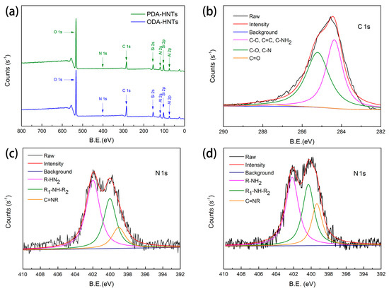 X-ray photoelectron spectroscopy (XPS) wide-scan and high resolution spectra of HNTs samples. (a) wide-scan XPS spectra of PDA-HNTs and ODA-HNTs; (b) C 1s core-level of PDA-HNTs; (c) N 1s core-level of PDA-HNTs; (d) N 1s core-level of ODA-HNTs.