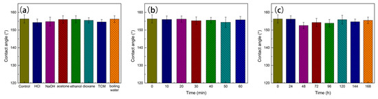 To evaluate the environment durability performance of superhydrophobic HNTs, various tests were conducted corresponding to different harsh conditions. As shown in Figure 8a, the CAs of VM/ODA-HNTs were all maintained above 150° after immersing these superhydrophobic samples into diverse chemical conditions including solutions of HCl (pH = 3) and NaOH (pH = 11), acetone, ethanol, dioxane, and trichloromethane (TCM) for 24 h at room temperature, and boiling water for 3 h, which demonstrated the resultant superhydrophobic HNTs had great chemical resistances. Figure 8b shows the variation of CAs after ultrasonic washing the superhydrophobic HNTs samples with 60 min. These values were all above 150° at different ultrasonic times, indicating that the loaded PDA layers had strong adhesive properties, just like the mussel byssuses. The outdoor durability tests were carried out by exposing the superhydrophobic HNTs samples to sunlight, and the CAs results were recorded at 24 h interval as presented in Figure 8c. Apparently, all of the values remained at about 150° after solar radiation, suggesting that the samples had excellent stability to endure the harsh outdoor environment.