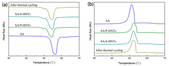 Differential scanning calorimeter (DSC) curves for heating (a) and cooling; (b) of stearic acid (SA) and form-stable composite phase change materials (PCM).