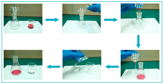 Oil/water separation technique is one of the most favorable methods of wastewater treatment [35,37]. Due to the abundant pore structures and high surface area, HNTs may be used as an absorbent substrate to separate water from the oil/water mixture. However, the natural HNT has no selective absorption for oil and water. Hence, it can only be used to remove water-soluble cationic and anionic contaminants from wastewater [57]. Excitingly, the resultant superhydrophobic HNTs (S-HNTs) that have unique water resistance property and strong oil-absorbing capacity are promisingly suitable as a filter for oil/water separation. As shown in Figure 10, trichloromethane (TCM, dyed with Oil Red O)/water mixture was poured onto the facility apparatus, then TCM penetrated through the S-HNTs layer spontaneously, and was finally dripped into the collecting conical flask. The separated water was blocked by the S-HNTs, remained inside the funnel, and then poured back into the beaker. The complete oil/water separation process can be achieved with a simple way and without demand of extra force, which showed that S-HNTs have great potential for use in oil/water separation.