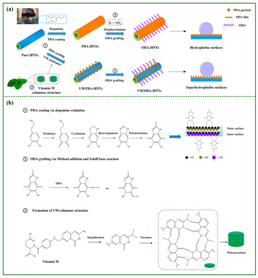 The production process and reaction mechanism of superhyophobic halloysite nanotube (HNTs). (a) Surface modification procedure of HNTs; (b) Chemical reaction mechanism: ① Illustration of oxidation polymerization and probable connection mode of dopamine on HNTs [33]; ② The mechanism of grafting octadecylamine (ODA) to obtain roughness surface via Michael addition and Schiff based reactions; ③ The formation of Vitamin M (VM) tetramer and the resultant columnar structure.