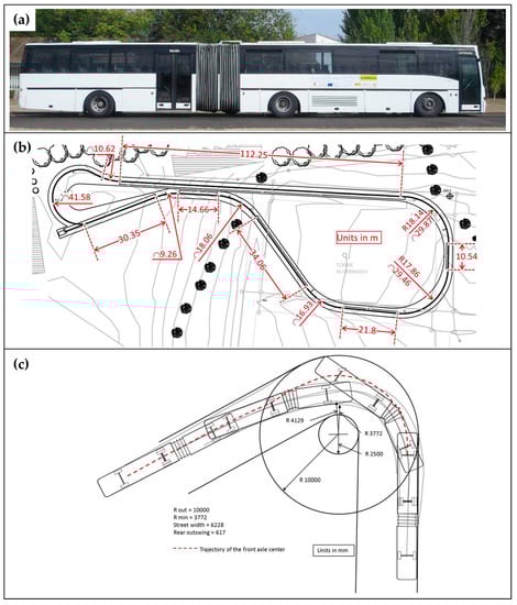Experimental platform main elements. (a) Articulated bus Volvo B10M-ART-RA-IN; (b) inner road facility dimensions; (c) Bus trajectory analysis in one section of the path.